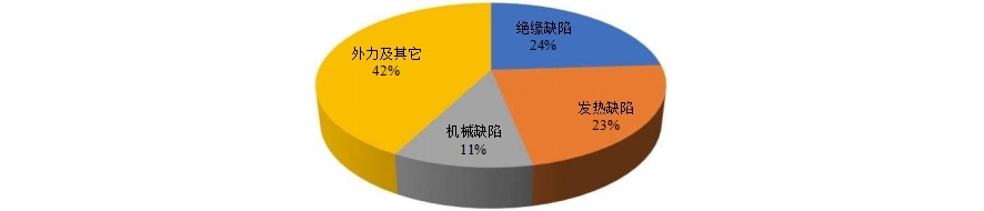 根据调研统计结果表明,外力因素占比最大,因调研中外力因素多为天气及人为等因素并无直接导致设备缺陷,故以下分析中外力及其它因素仅纳入统计分析不作故障考虑。图中真正影响配网开关柜的典型缺陷主要是绝缘类缺陷、发热类缺陷和机械类缺陷三种。